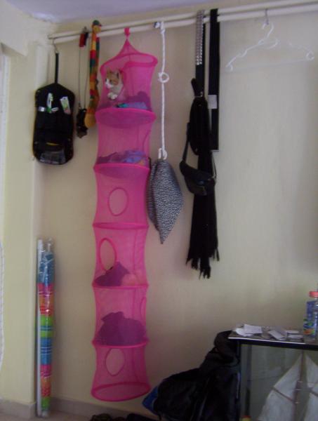 Hier: Eine Ecke in meinem Zimmer; mit pinkem Netz-Regal (das war schon hier, das war ich nicht!) und Kletterkönig Maus. kleines, schmutziges, freches Viech. (: